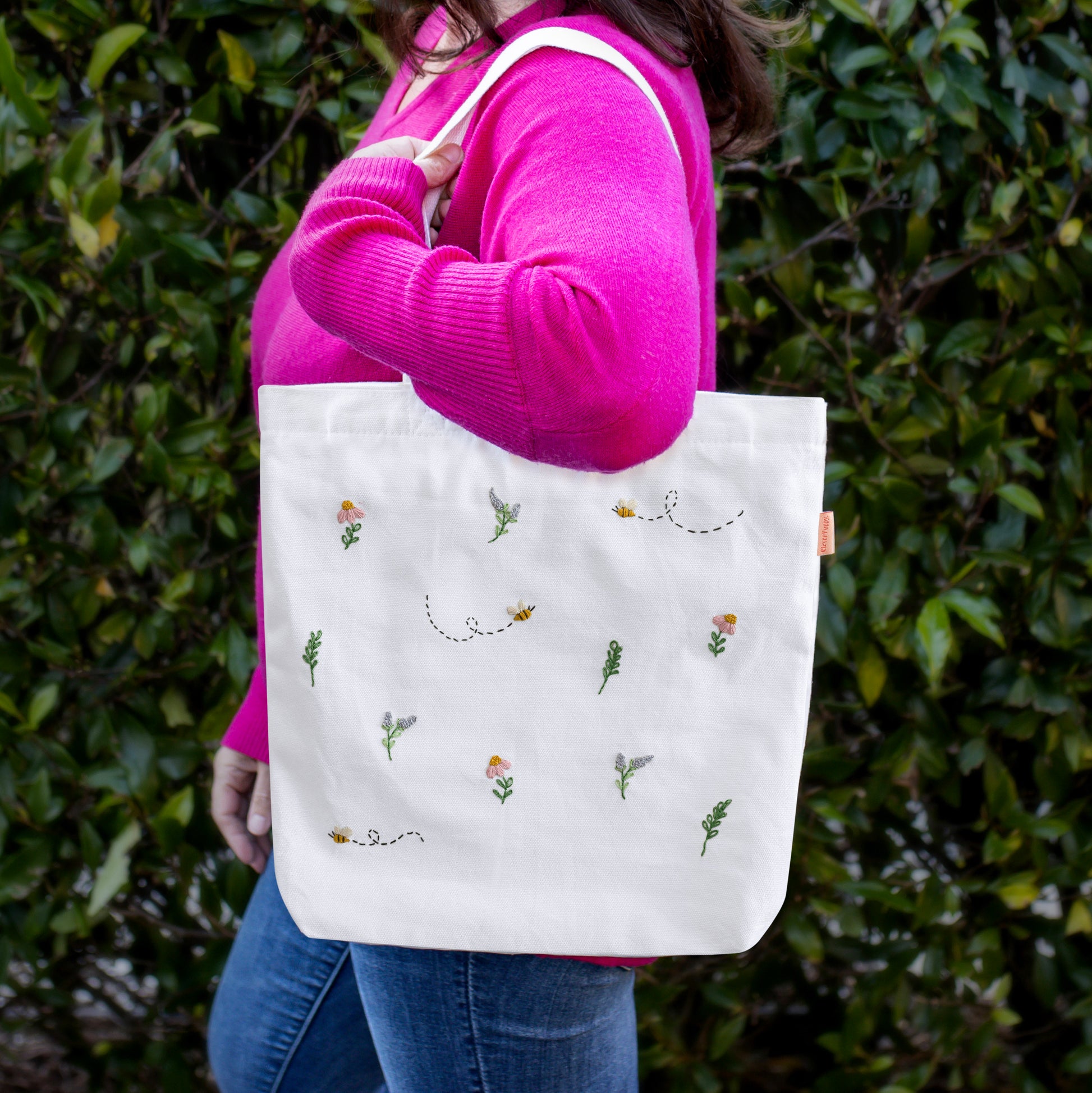 You’ll be sure to be on the go in style with this charming bees and florals-themed tote bag embroidery kit.