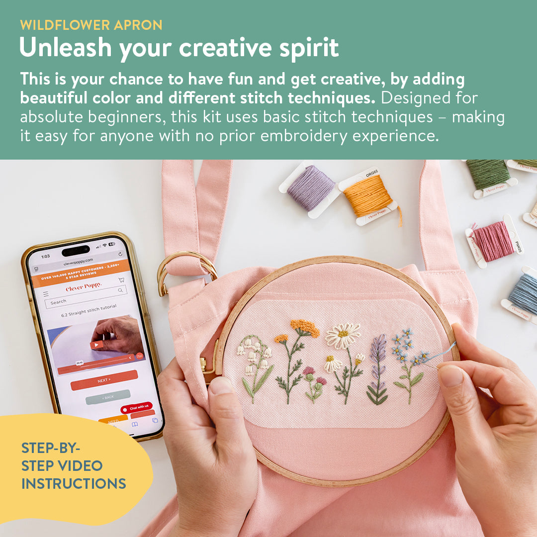 With easy-to-follow video tutorials and our signature wash away embroidery stickers, you’ll learn stitches while creating something truly practical and pretty. Perfect to wear while cooking, crafting, or gardening, this apron also makes a heartfelt and one-of-a-kind gift for someone who loves a personal touch.